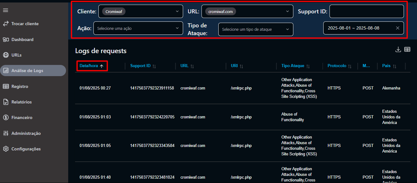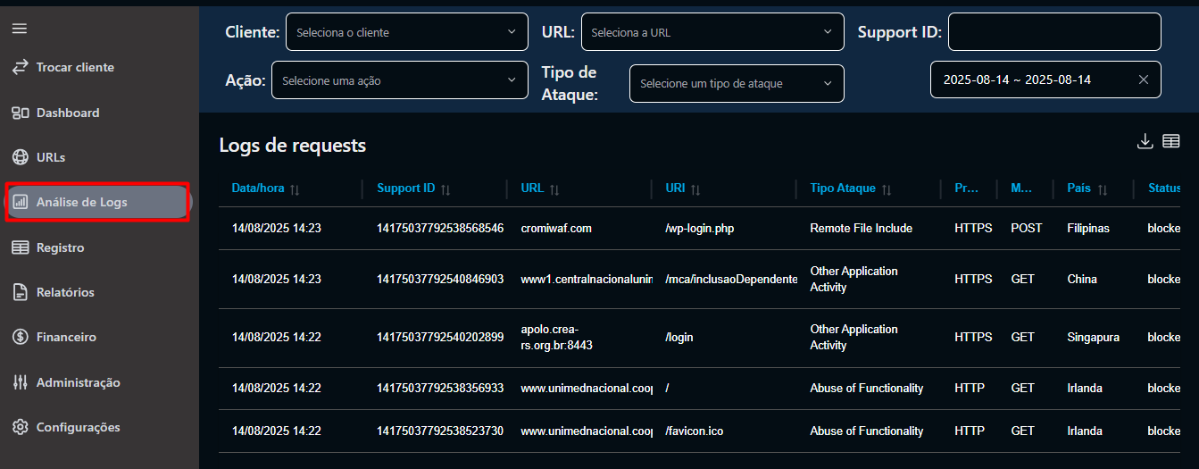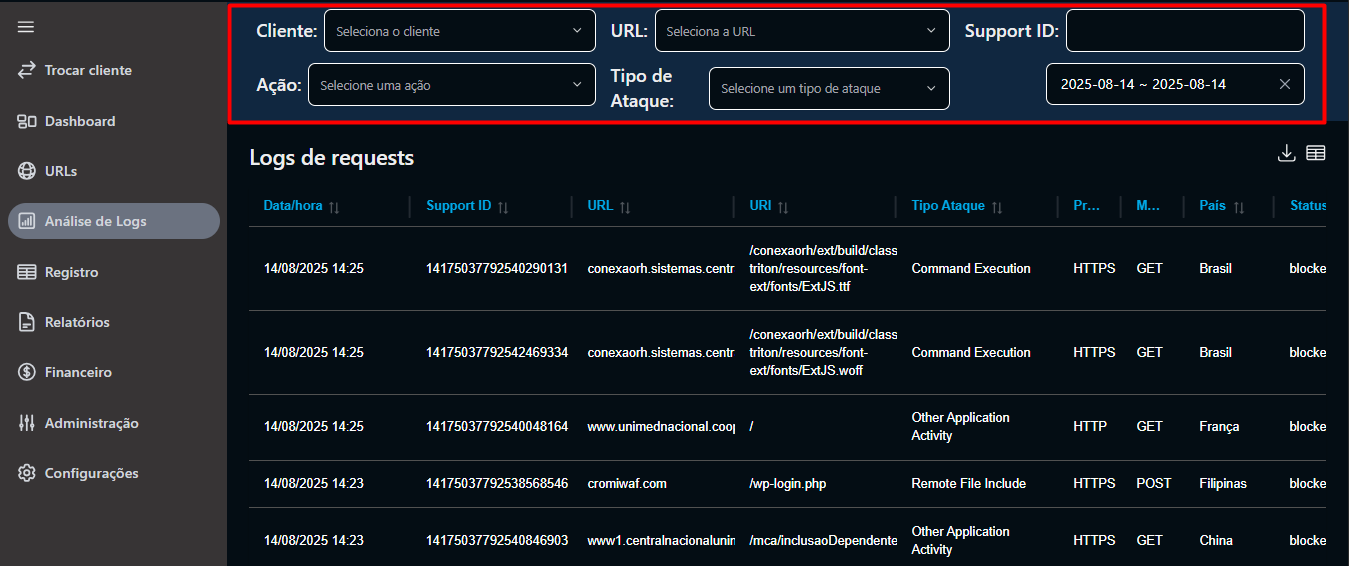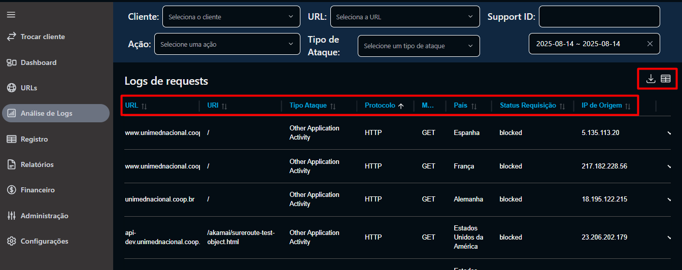 Botão exportar/download (canto superior direito) → exporta os logs.